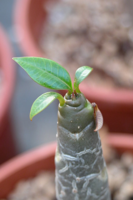 今年過年後氣溫慢慢升高,二月的均溫比往年都高,至二月底中部高溫已達30℃。去年6月播種的雞蛋花,經冬天落葉休眠,趁此時趕快換盆。因為要讓這些實生苗有更長的生長期,才能趕快長大開花。仔細觀察其莖頂,新葉已開始長出,而在去年年底扦插的雞蛋花枝條,也才開始要冒芽。