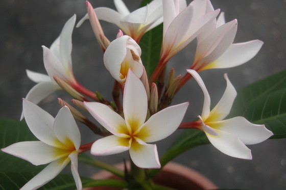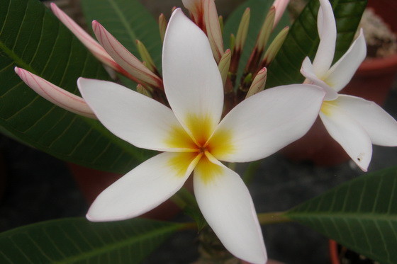去年在台南收集幾種雞蛋花,最近有一個白花的品種開花了,它的花苞有點帶粉紅色,但開花後接近白色。這品種花瓣較細長且為尖形,是比較少見的花形,且香味也濃,開花時植株也才20幾公分。