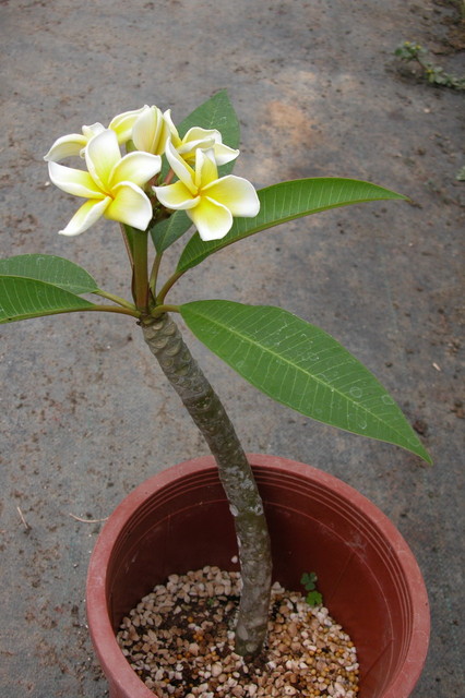 這個品種香味濃,黃色的花瓣邊緣反捲,形狀很像風車,是很特別的品種。這株也是在去年年底扦插,今年春天才冒芽開花,它的高度只有20幾公分。若雞蛋花都能控制這種高度而有觀賞價值的話,一定能吸引更多愛好者,因為一般人印象中認為雞蛋花都要長成樹,無法以小型盆栽來表現。