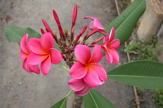 另外在我兒子的國小圍牆外有戶人家也種植一盆約2米 高的粉紅色雞蛋花,它開的花序非常大,直徑約有20公分以上,它的花色和香味跟上述在托兒所的品種很相近,有可能是同一品種。這兩株還有一個相同的特性,就是很容易自己結果莢,因為不是所有的雞蛋花品種都會自己結莢的。
