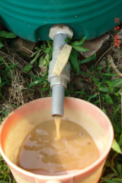 廚餘桶底部有過濾的塑膠網,將多餘的水隔離在桶子底部,若底部廚餘水太多要將它從桶外的管子接出來,可直接加水就成肥料水來澆菜,或將廚餘水儲存在塑膠桶等完全腐熟變黑,再拿來用會更好。