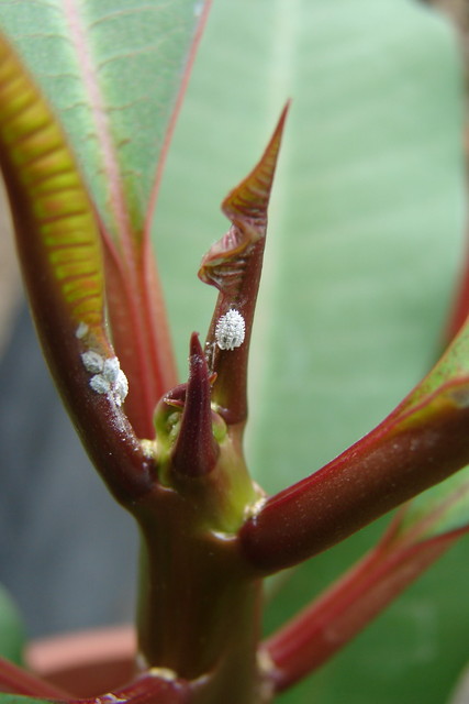 去年我在田裡種一株雞蛋花,今年長好快,葉片又大,枝條長了足足有30 -40公分高,眼見其中有一枝條頂端已經有花序長出來,卻遇上了颱風。結果整株倒伏,葉片幾乎全被吹斷。颱風過後我趕緊將它扶正,看起來好像還能開花,但幾天過後,竟然有蝸牛來危害,它專吃樹皮,連花序都不放過,雞蛋花不是有毐嗎?現在只能期望其他的枝條能在今年開花了。