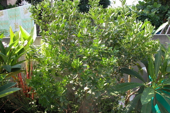 我妹家之前盆裡長了一棵檸檬,我想看自己嫁接技術好不好,就接了金桔,後來還真得接活了。但這盆金桔種在盆裡一直都長不好,於是在前年田裡開始運作後,就將它種在地上,經過一、二年的生長,已經長到2米高,且幾乎整年都會開花結果。