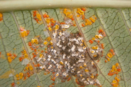 在嚴重的鏽病菌絲上可見到另一種白色的真菌,可能是鏽病的天敵。