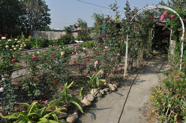 原來阿伯就住在鐵路旁,喜歡種花,尤其玫瑰花,還去買書來學習種植,這就讓我想到我小時候也是這樣,所以我和他特別有話聊。原本阿伯是住在南投山上種梅子,後來因土石流才搬來虎尾,他發現鐵旁雜草漫生,花了很多時間才整理出現在的美麗花園和菜園,阿伯說這是公家的地,歡迎大家來賞花採菜。
