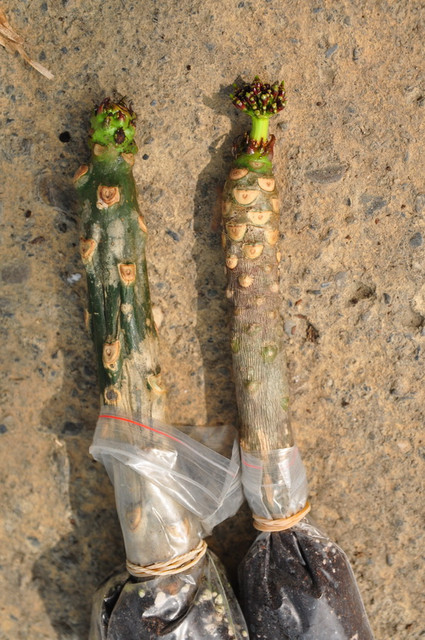 所以雞蛋花以枝條做扦插時一定要取頂梢,但有時不注意頂端是否有花芽,扦插到一半才發現,這種枝條長根就較一般正常的頂梢枝條慢得多。但若遇到這種情況可以先剪掉花芽以免浪費養分,且有助側芽趕快長出來。